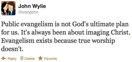 • Did you get this quote/tweet from “Let the Nations be Glad?” It, honestly, sounds exactly like the book, except the book uses the word missions instead of public evangelism (and, I believe, can be used interchangeably). Just wondering…